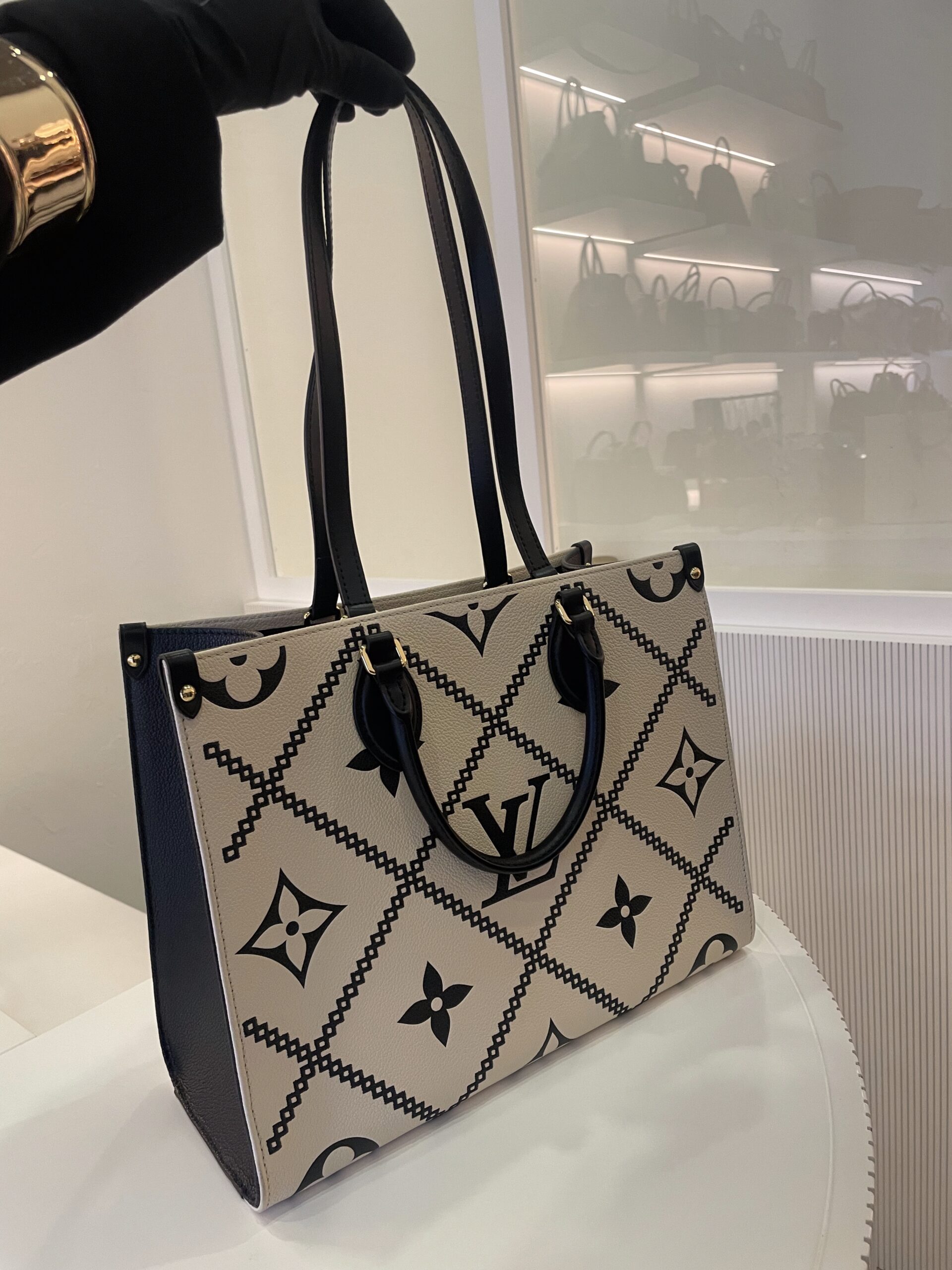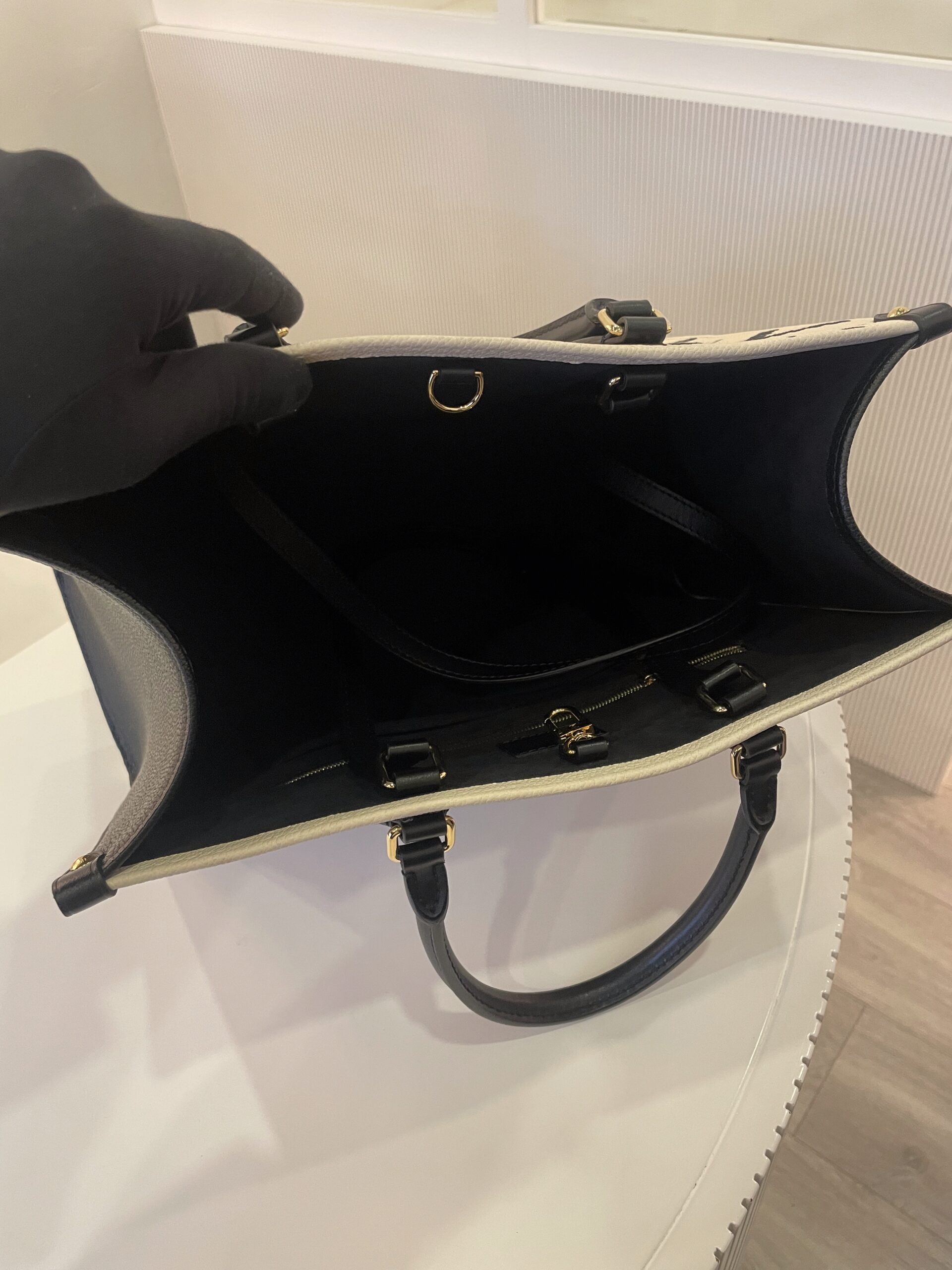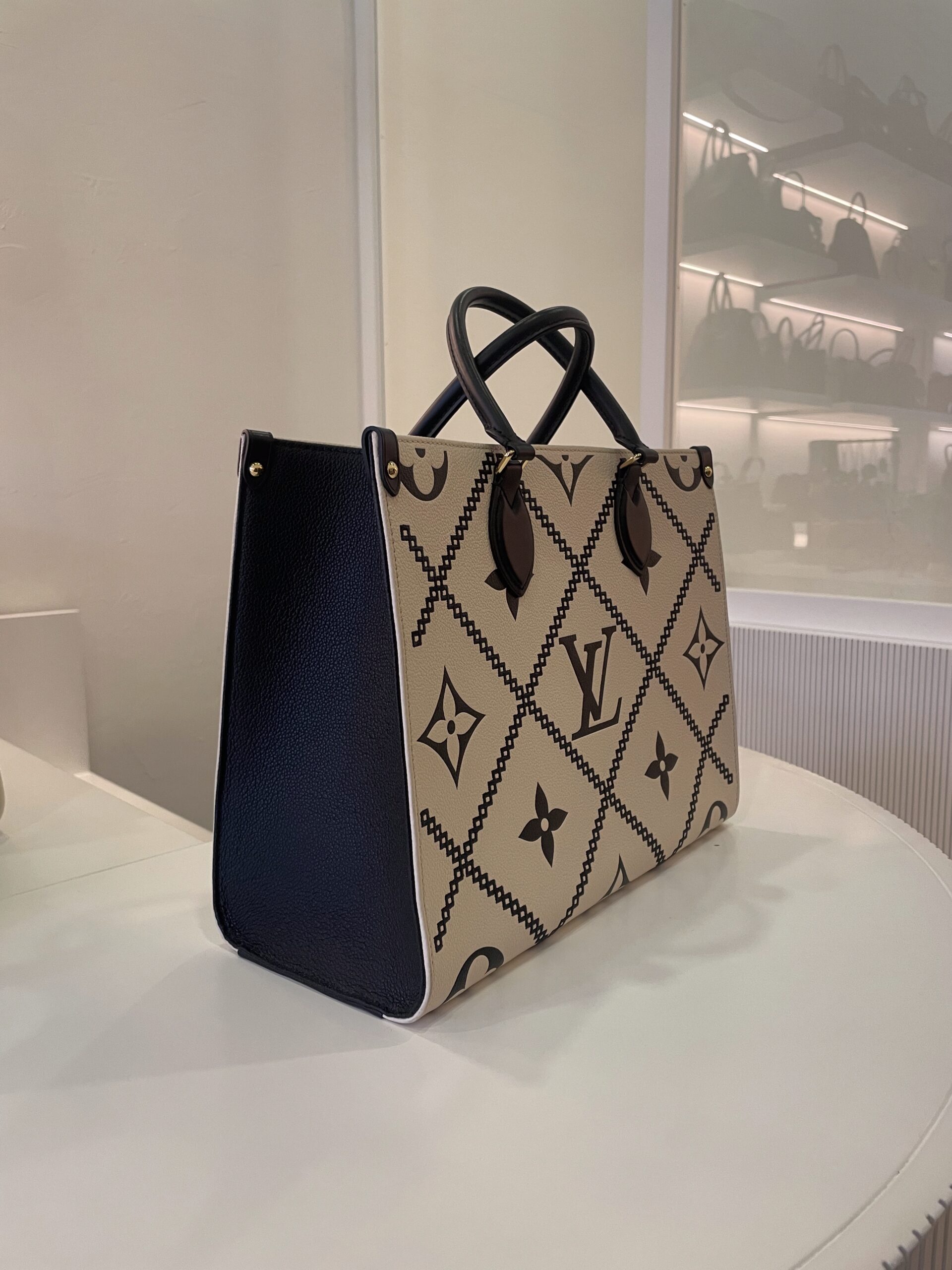 Cabas Louis Vuitton Onthego en cuir noir et blanc Vendu avec dustbag Dimensions : 34 x 27 x 14