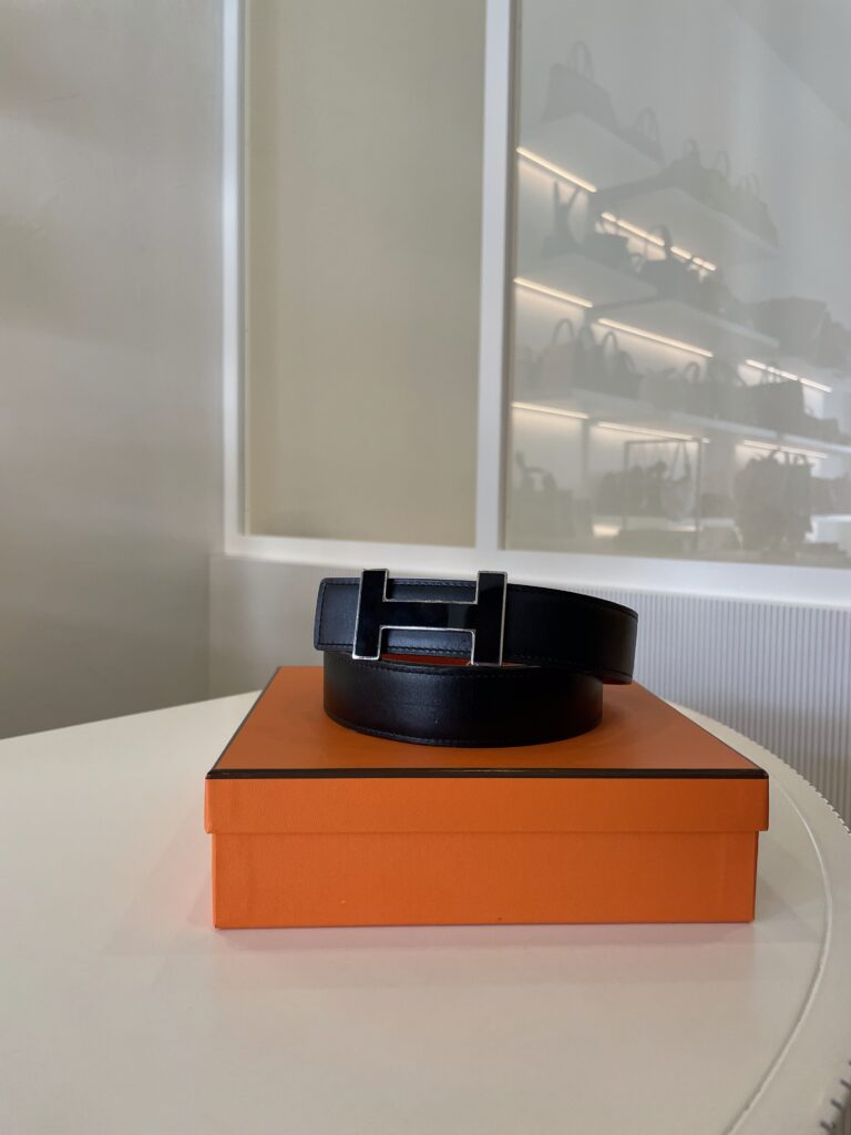 Ceinture Hermès T. 85 cm (reversible) Vendu avec boite Quelques tâches sur le côté orange. Faibles rayures sur la boucle.
