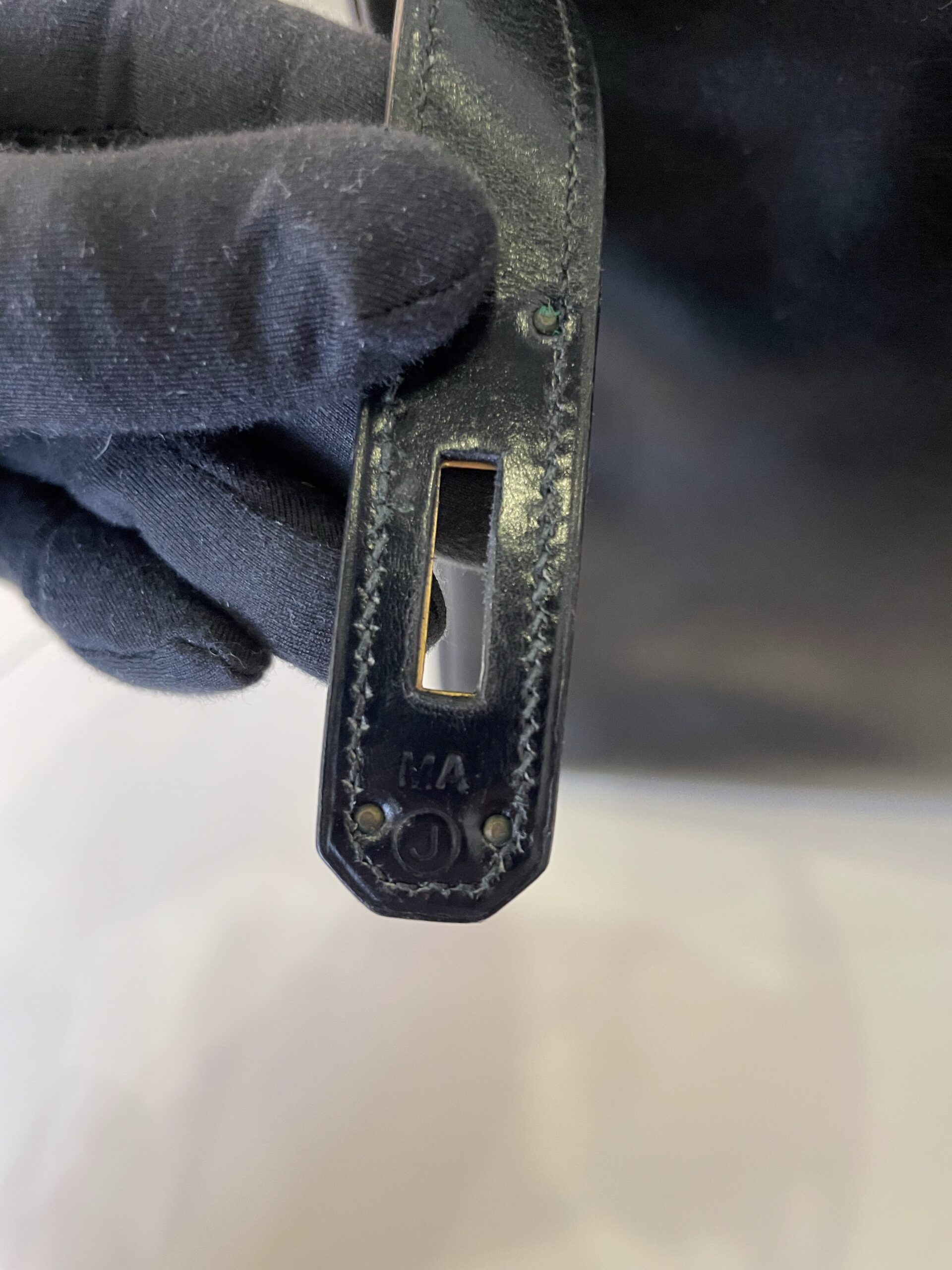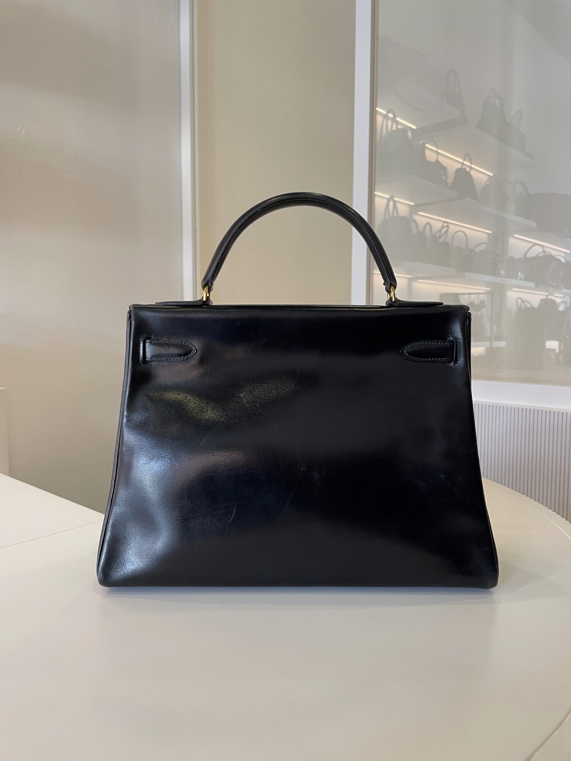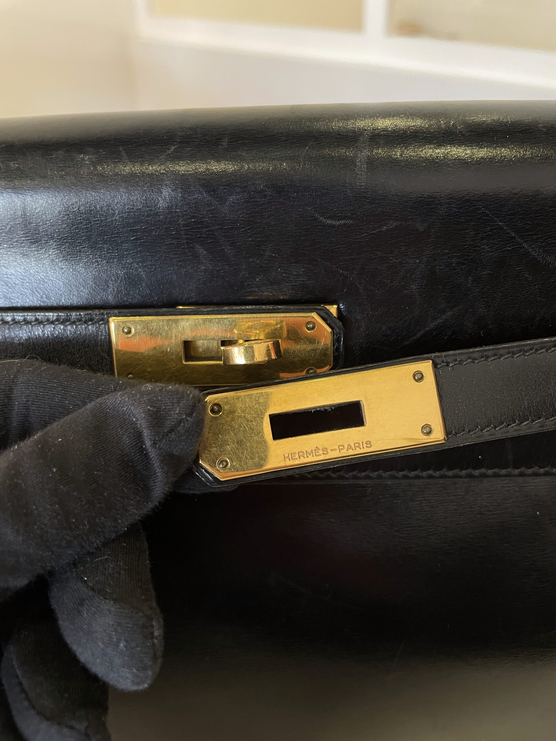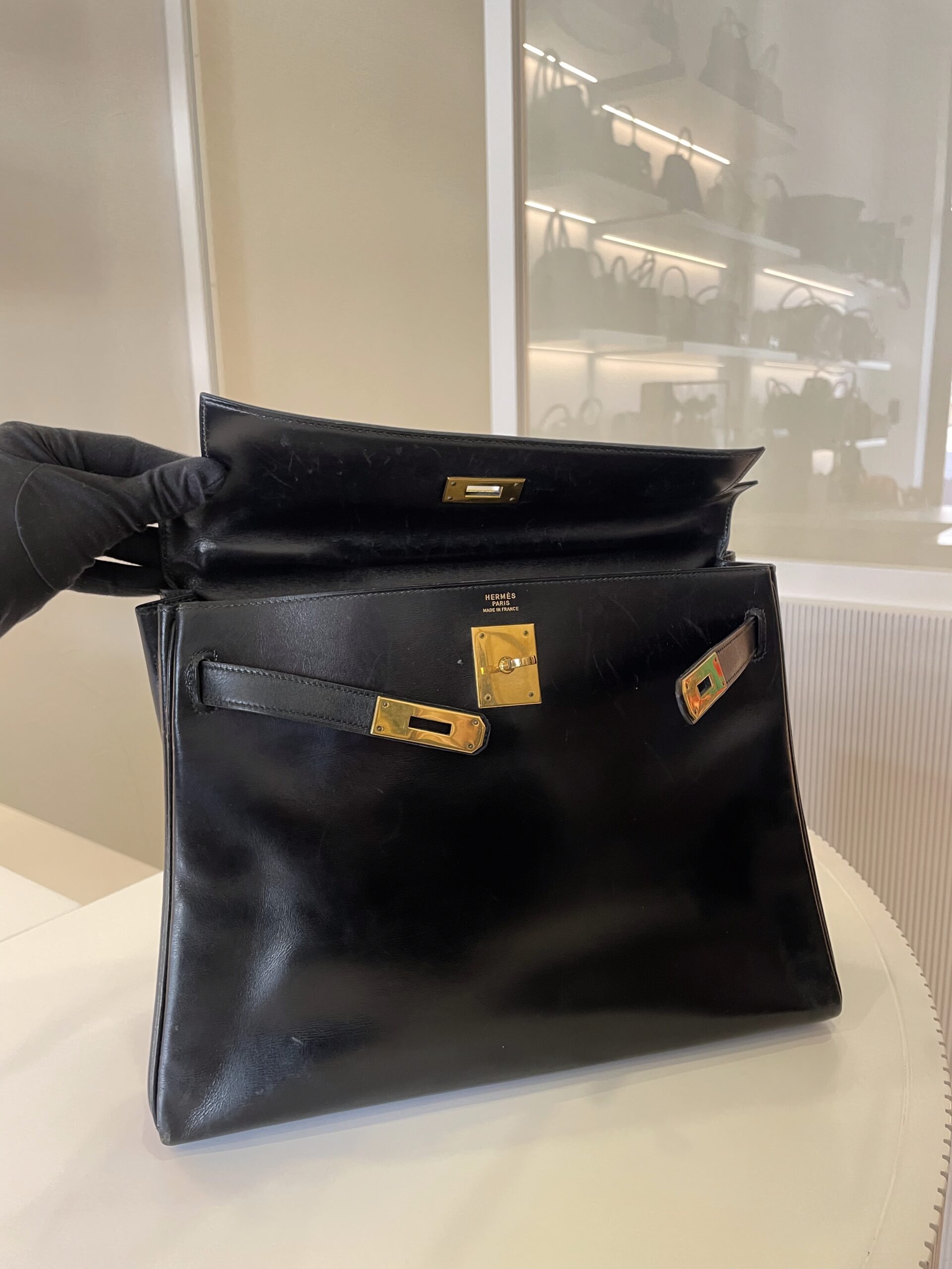 Sac Hermès Kelly 32 vintage en cuir box noir année : 1980 Pas de bandoulière Quelques signes d’usures et quelques rayures sur la bijouterie Vendu avec clochette, cadenas et dustbag Dimensions : 32 x 23 x 12