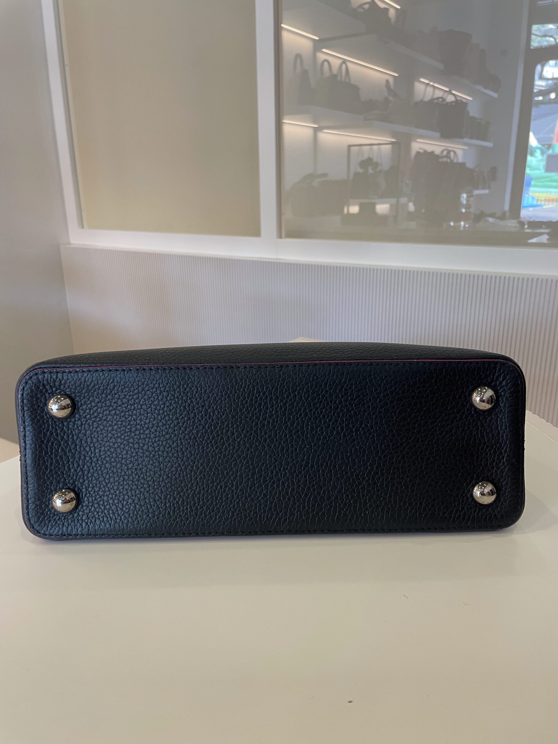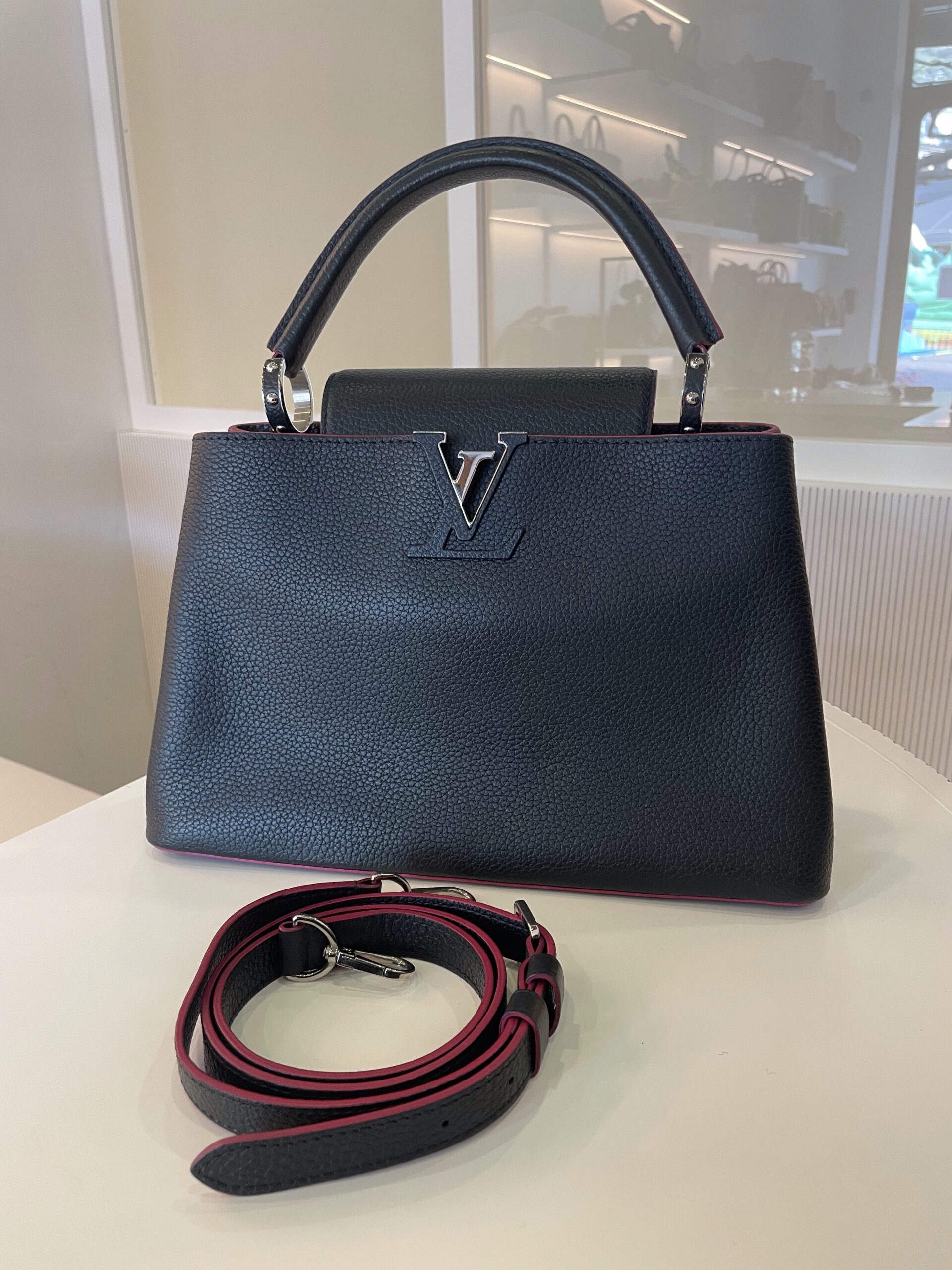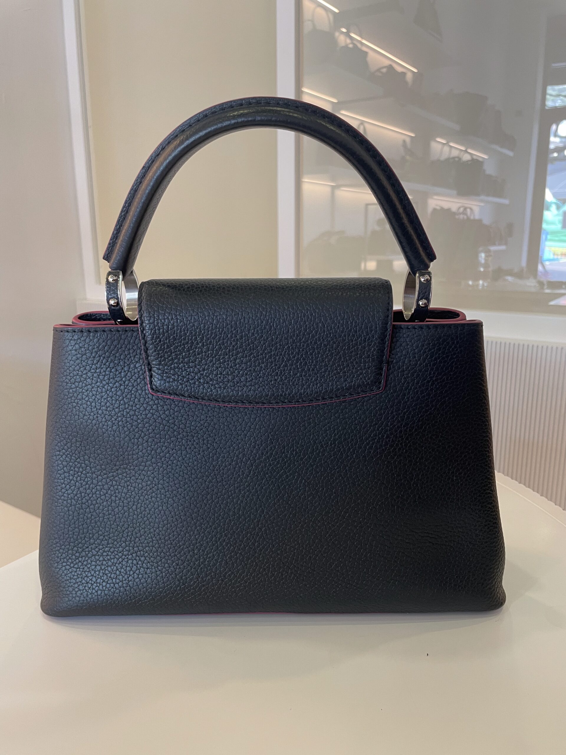 Sac Louis Vuitton capucines MM bleu marine, bord rose Dimensions : 31 x 20 x 11 cm Vendu avec dustbag et bandoulière