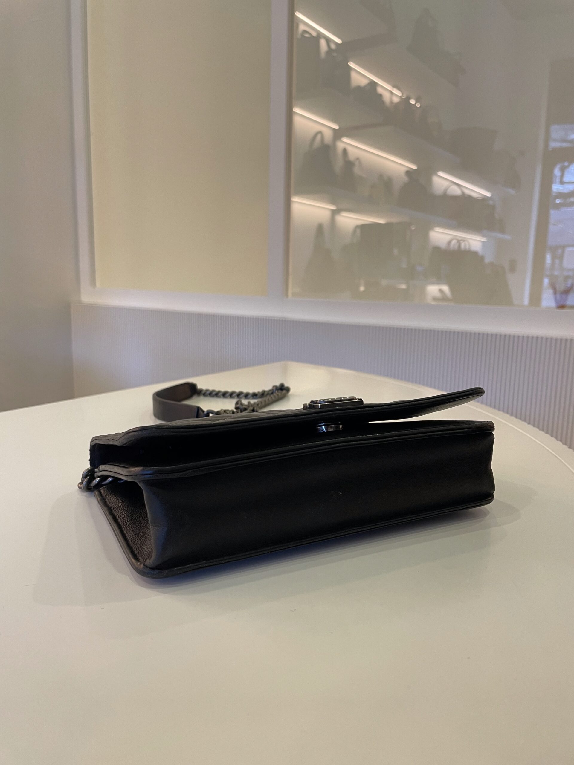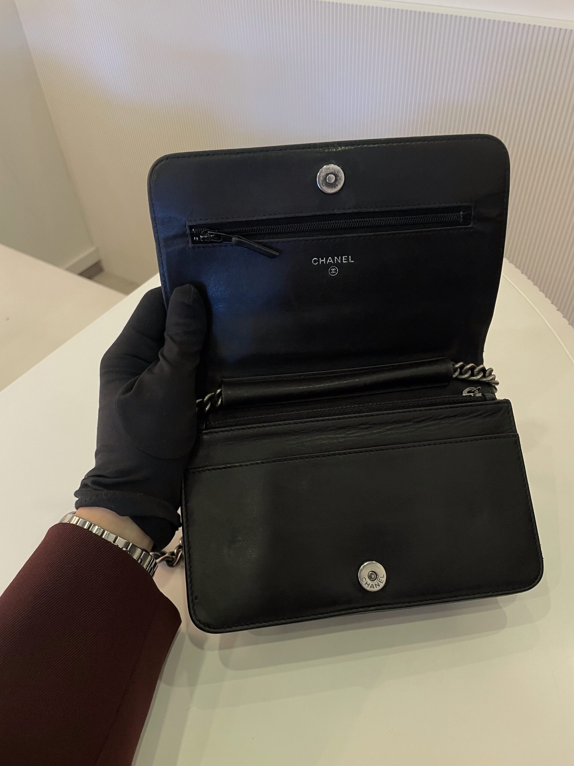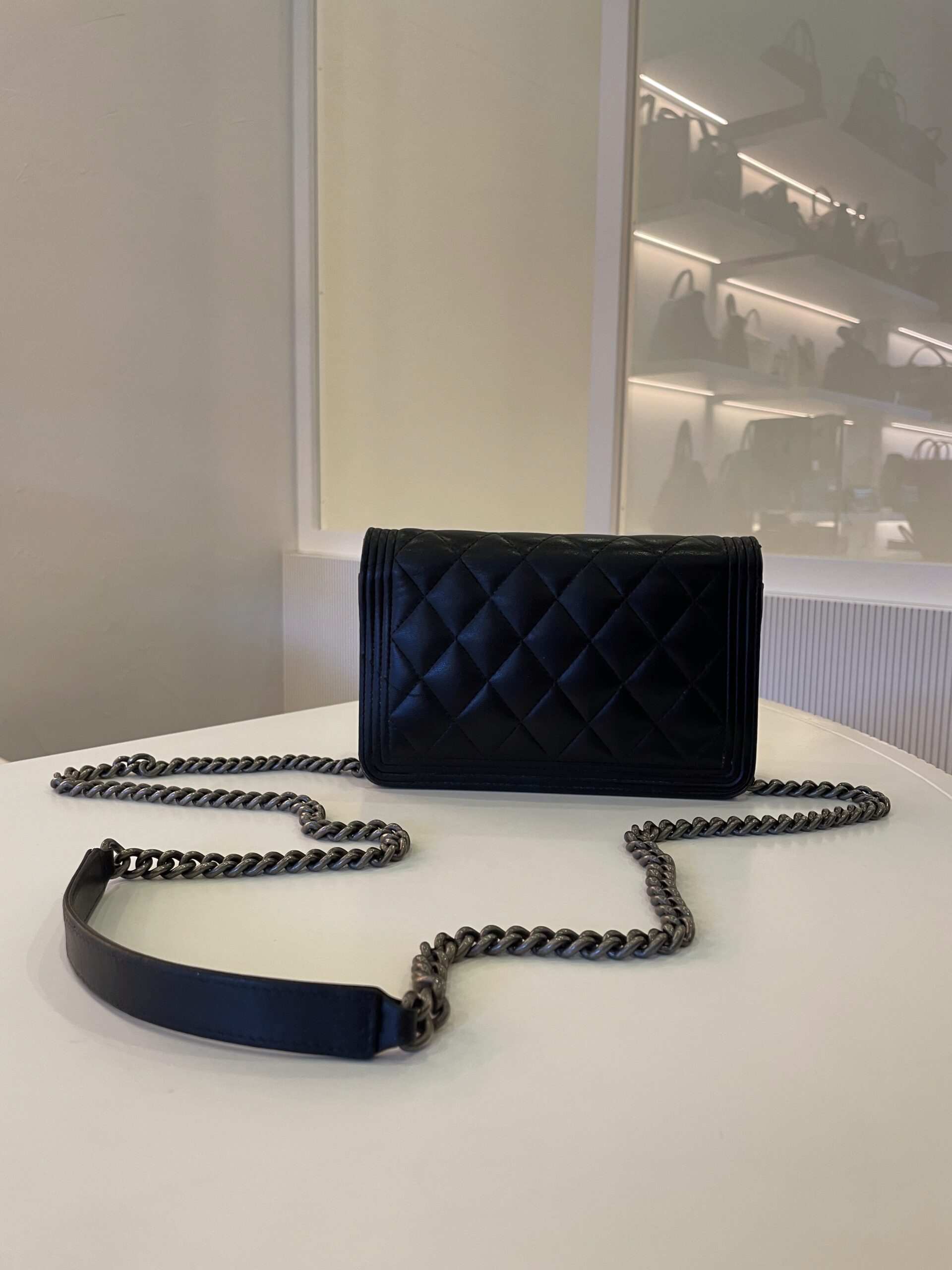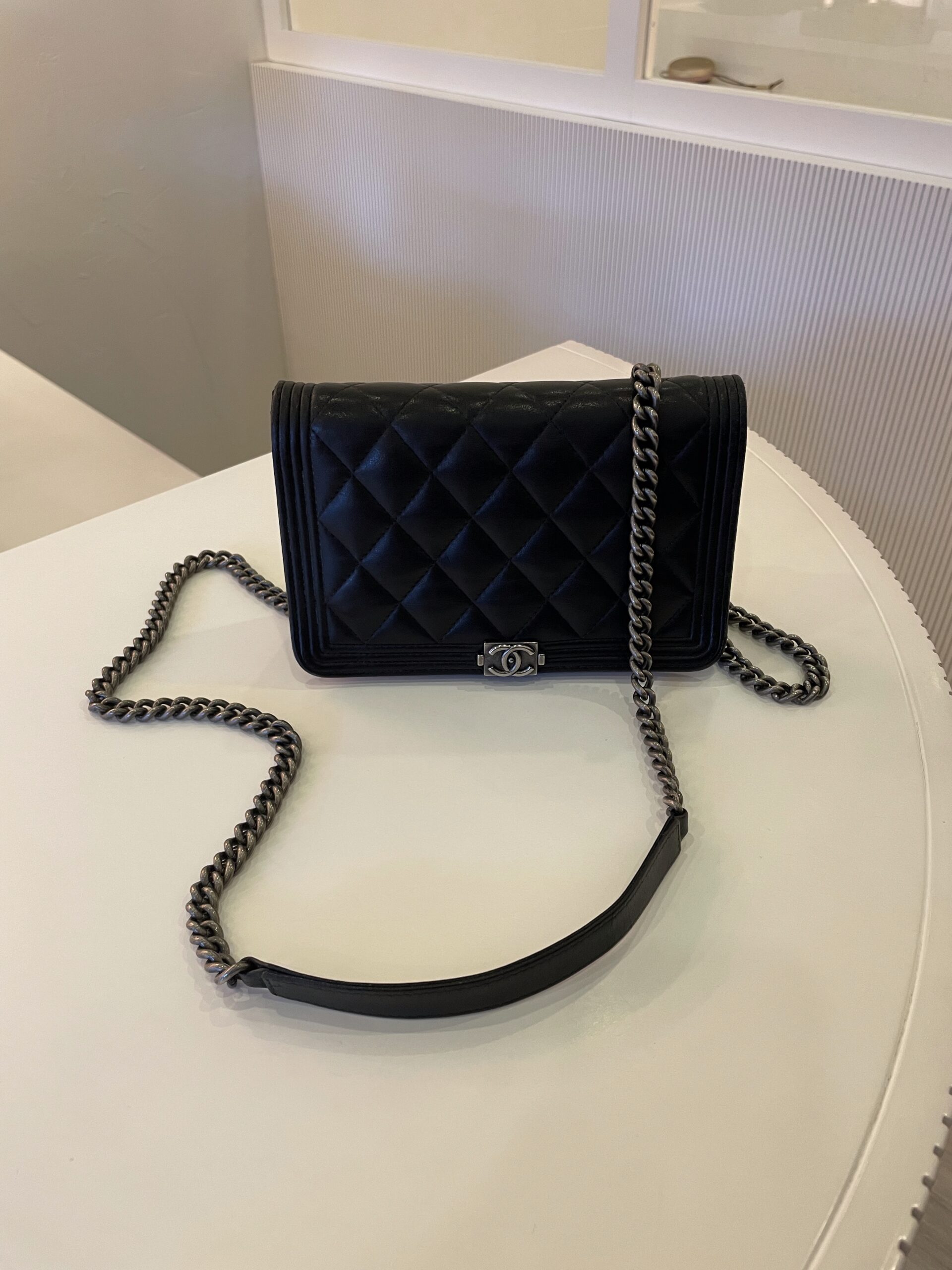 Sac Wallet on chain Chanel Boy Cuir lisse et chaine finitions effet vieilli Mesures: 19x12x6 Vendu avec dustbag Faibles signes d’usure